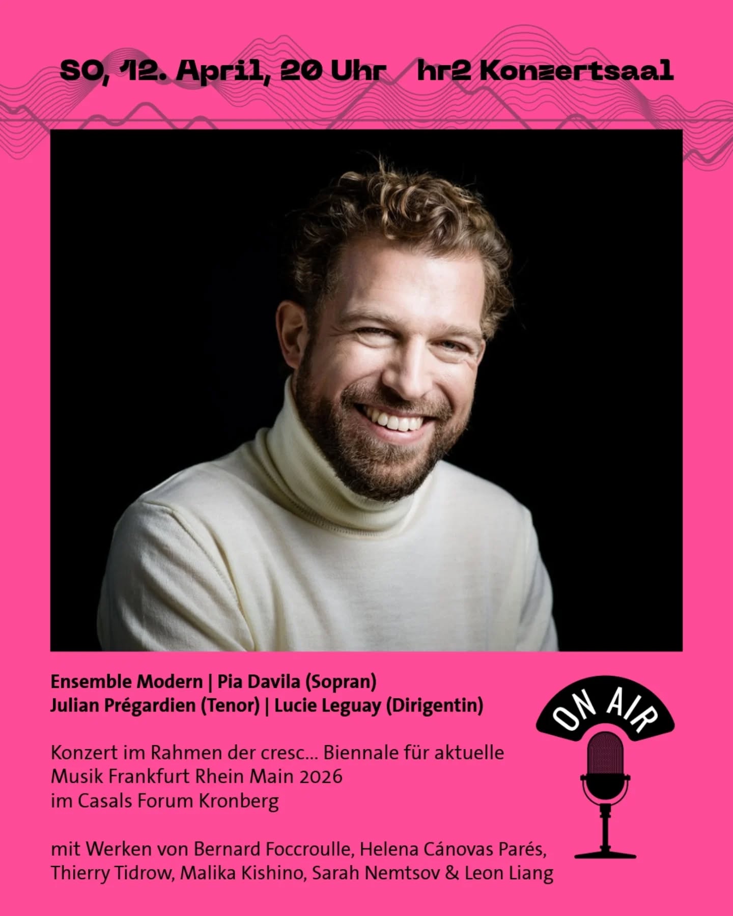 Radio-Tipp! 📻🎶 Sonntag, 14. April, 20 Uhr, hr2.de Die Uraufführung ›Theres – Liederzyklus in fünf Episoden und fünf Kontrapunkten‹ im Rahmen der cresc… Biennale für aktuelle Musik Frankfurt Rhein Main zum Nachhören! Im Zentrum des Theres-Liederzyklus steht die Idee einer »zeitgenössischen Winterreise«: eine Hommage an Franz Schubert und zugleich eine Neuverortung in der Gegenwart. Dafür haben Komponist*innen unterschiedlicher Generationen neue Werke geschaffen. Die verwendeten Texte verweben historische Stimmen mit aktuellen Reflexionen und spannen so den Bogen von der Romantik bis ins heute. Mit Werken von Bernard Foccroulle, Helena Cánovas Parés, Thierry Tidrow, Malika Kishino, Sarah Nemtsov & Leon Liang 🎧 Aufnahme vom 08. Februar 2026 aus dem Casals Forum Kronberg. Ensemble Modern Pia Davila (Sopran) Julian Prégardien (Tenor) Lucie Leguay (Dirigentin) 📸 Peter Rigaud cresc... wird ermöglicht durch den @kulturfonds. Dieses Konzert wird gefördert durch die @gvl_de. #ensemblemodern #contemporarymusic #radiosendung #hr2